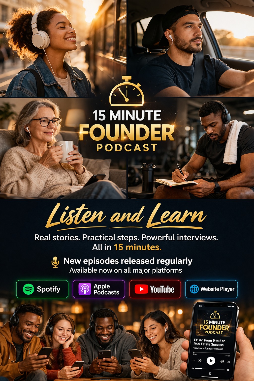 The 15 Minute Founder Podcast highlights practical insights on entrepreneurship, financial positioning, housing readiness, and ownership strategy.